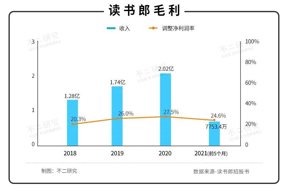 同期,经调整后净利润为2682.2万元、6943.5万元、9201.3万元和3347.4万元;经调整净利润率为4.2%、10.4%、12.5%和10.6%,其中2021年前5个月读书郎净利润率,较去年同期的11.4%,同比下滑7.02%。