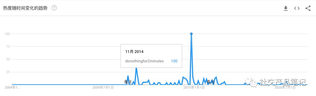 “donothingfor2minutes”网站可以被视为 Calm 发布前的一次最低成本试错,但这次没有像 Million Dollar Homepage 用了 4 个月时间。反而,从 2011 年上线的 3 年后,Calm 在 2014 年 11 月的 Google Trends 达到了 100 热度,正式进入了大众视野。