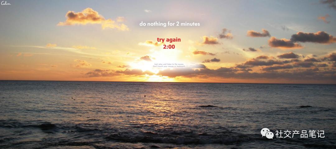 直到 2011 年,“donothingfor2minutes”网站上线。主页是一片夕阳下的大海,中间有 2 分钟时间倒计时,当用户无任何操作时开始倒计时并播放海浪声,一但移动鼠标或敲击键盘就会重新回到 2 分钟计时。(Calm 的 LOGO 在左上角)