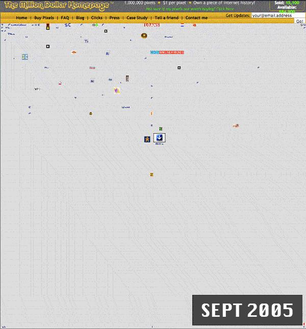 2005年,一位来自英国威尔特郡的21岁学生,刚刚进入诺丁汉大学工商管理系开始为期三年的学习,但他面临着可能要数年才会还清的助学贷款。于是,他想起了一个点子:创建 Million Dollar Homepage(百万美元首页)网站,首页由 1000×1000 像素的网格构成了共计 100 万像素的广告位。这些广告位以 10×10 像素为基本单位进行销售,每个像素售价 1 美元。