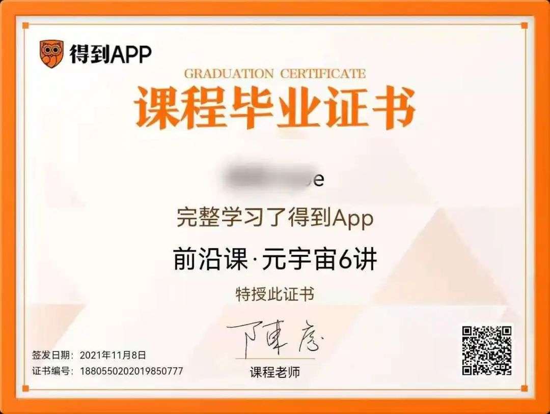 学习完《前沿课.元宇宙6讲》,还将颇有仪式感地收到签有主理人签名的毕业证书,有网友在得到上晒出自己的元宇宙课程毕业证书,听元宇宙课程、晒结业证书成了新的“社交通行证”。