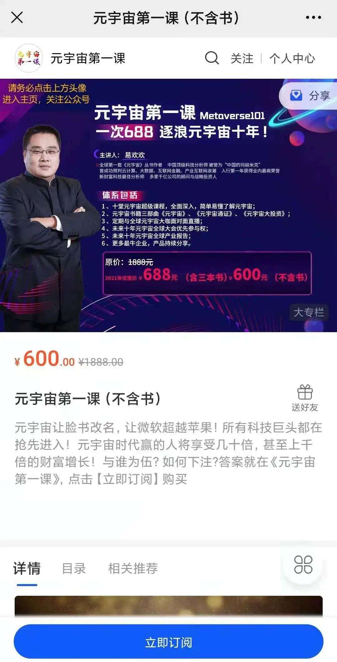 课程介绍颇具成功营销学风格:元宇宙时代赢的人将享受几十倍,甚至上千倍的财富增长,与谁为伍?如何下注?答案就在《元宇宙第一课》。