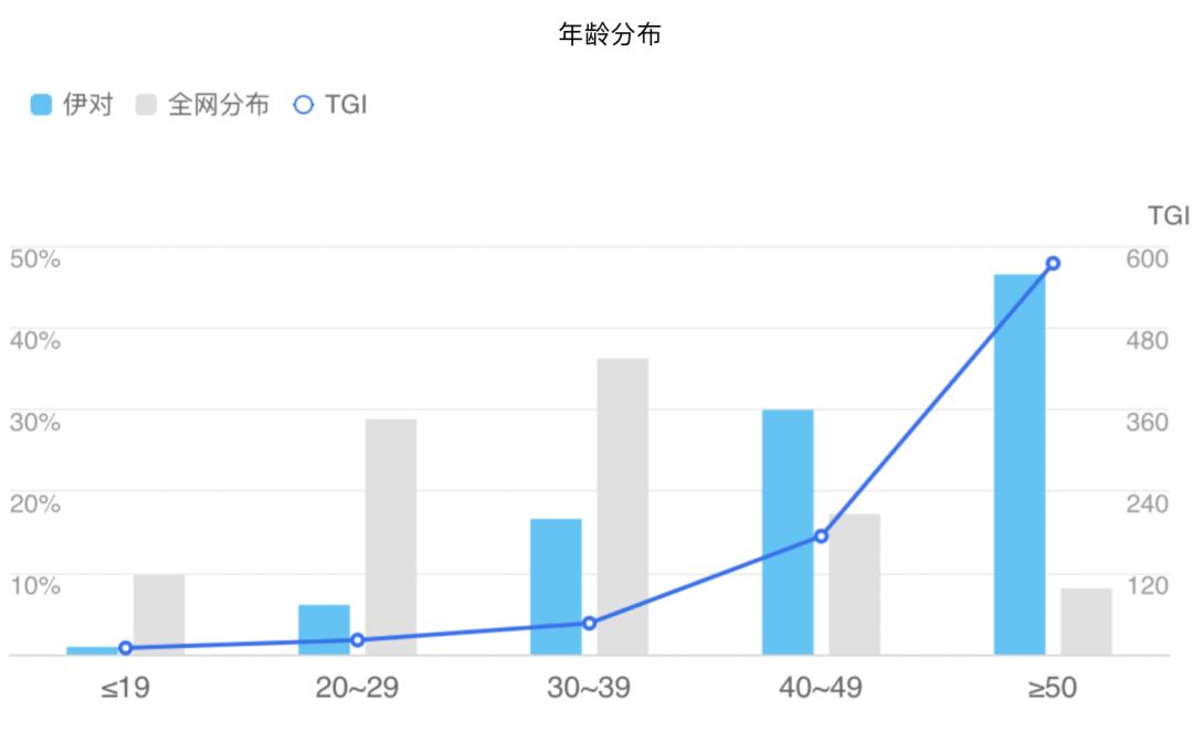 在社交这一类别中,视频恋爱相亲App伊对并没有对面向群体所具体的区分,但从百度指数的用户画像上看,50岁以上人群占比46.5%,超过其他年龄层,而且,其TGI指数接近600。(TGI指数高于100代表该类用户对某类问题的关注程度高于整体水平)