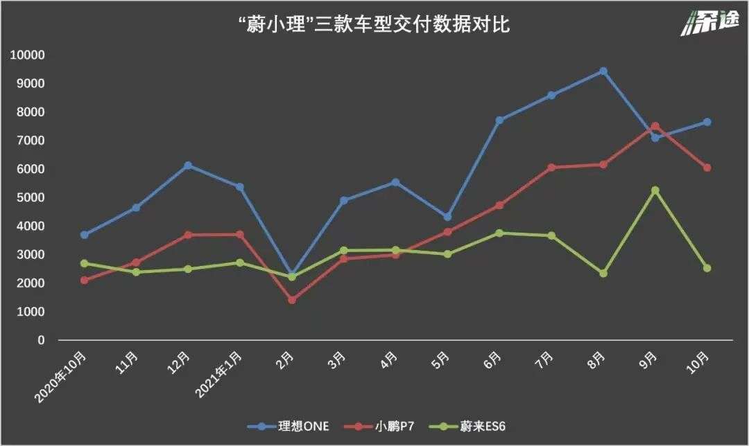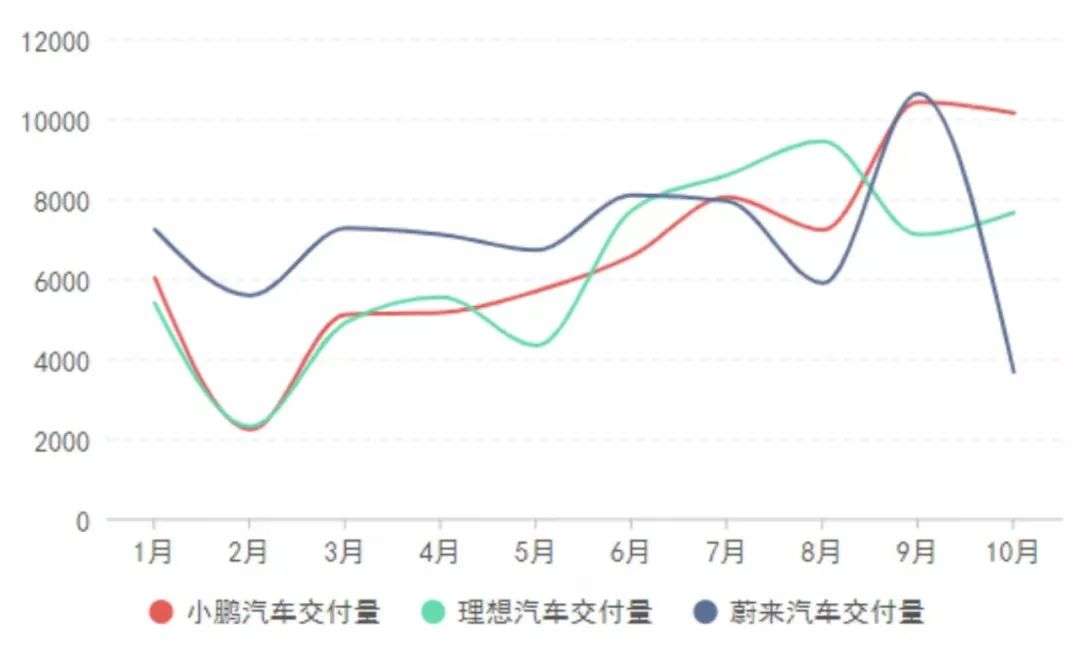 从交付量近12个月来看,理想ONE除了2月份销量低于3000辆(过年销售淡季),其他月份都在3500辆以上今年,也就是说理想一款车型,就赶得上蔚来10月份的整体销量略显尴尬。