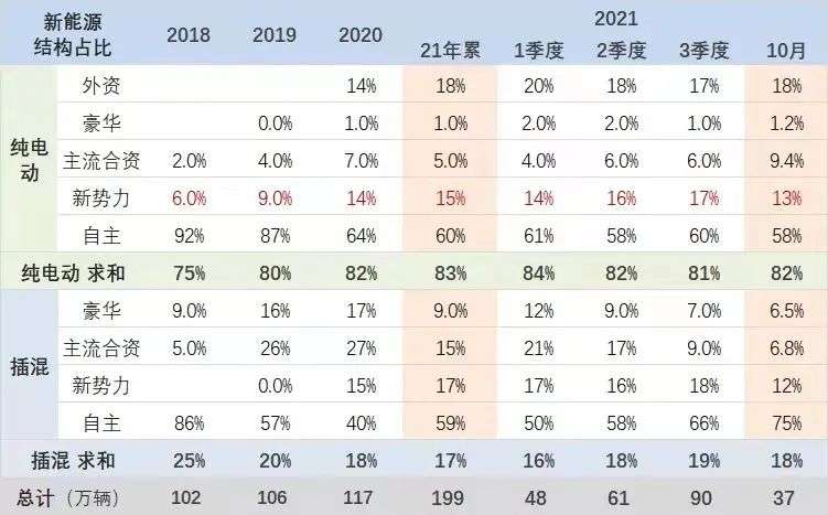 以往对于造车新势力有不少人认为这就是互联网泡沫,真造车还要看传统车企。但从乘联会的数据看,造车新势力纯电动销量占比已经从2018年的6%上升到了15%,而传统自主品牌销量占比却在持续下降。所以总的来看造车新势力是真的在搞发展,这个还是要肯定的。