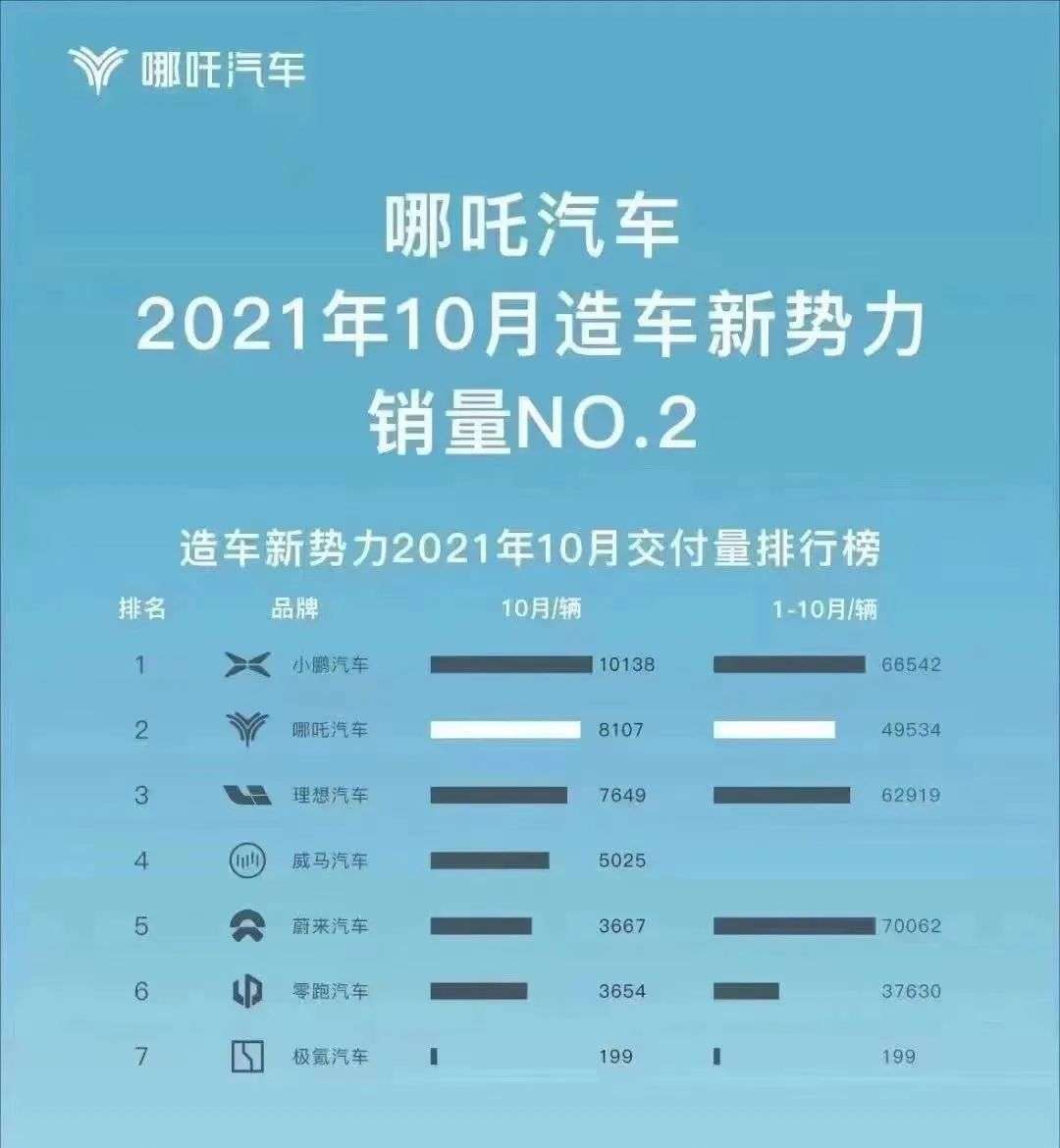哪吒汽车交付量持续攀升,才让这家公司走入大众视野。10月哪吒交付量为8107辆,同比增长294%,连续9个月打破交付记录,2021年1—10累计交付量为49534辆,同比增长398%,哪吒汽车累计交付量达到了75837辆。
