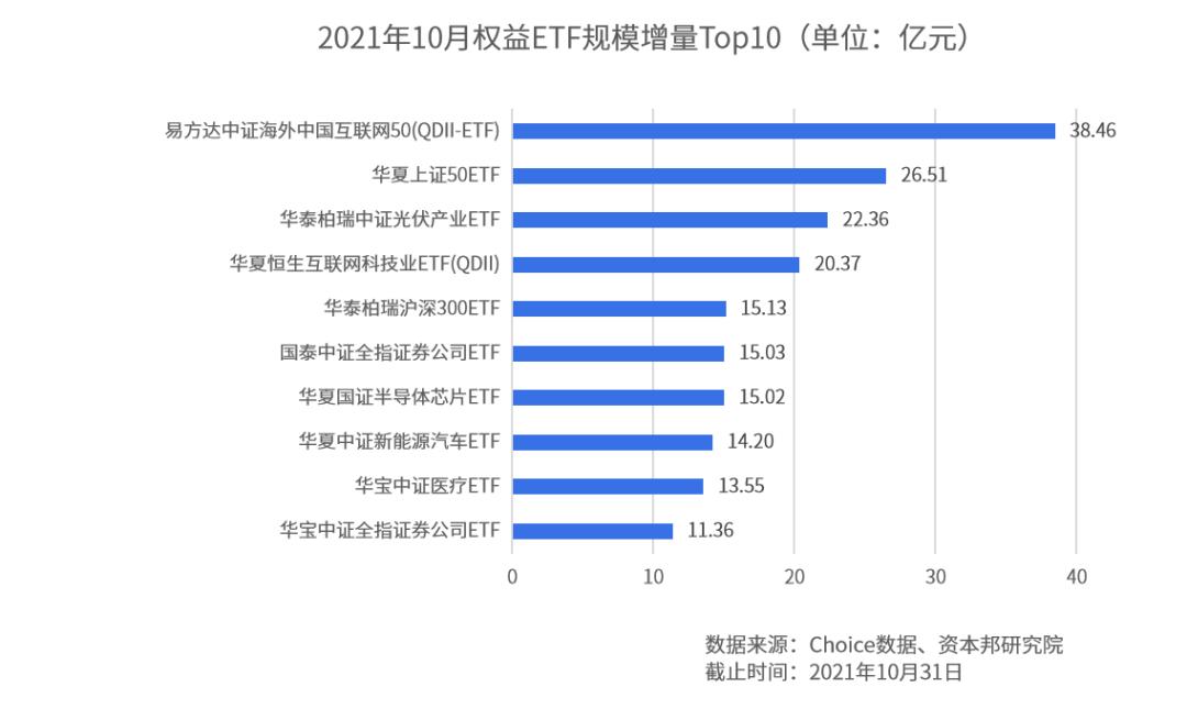多家基金公司权益类ETF已实现规模大扩容。从基金公司增量规模来看,今年10月份,权益类ETF规模增量最大已超百亿。
