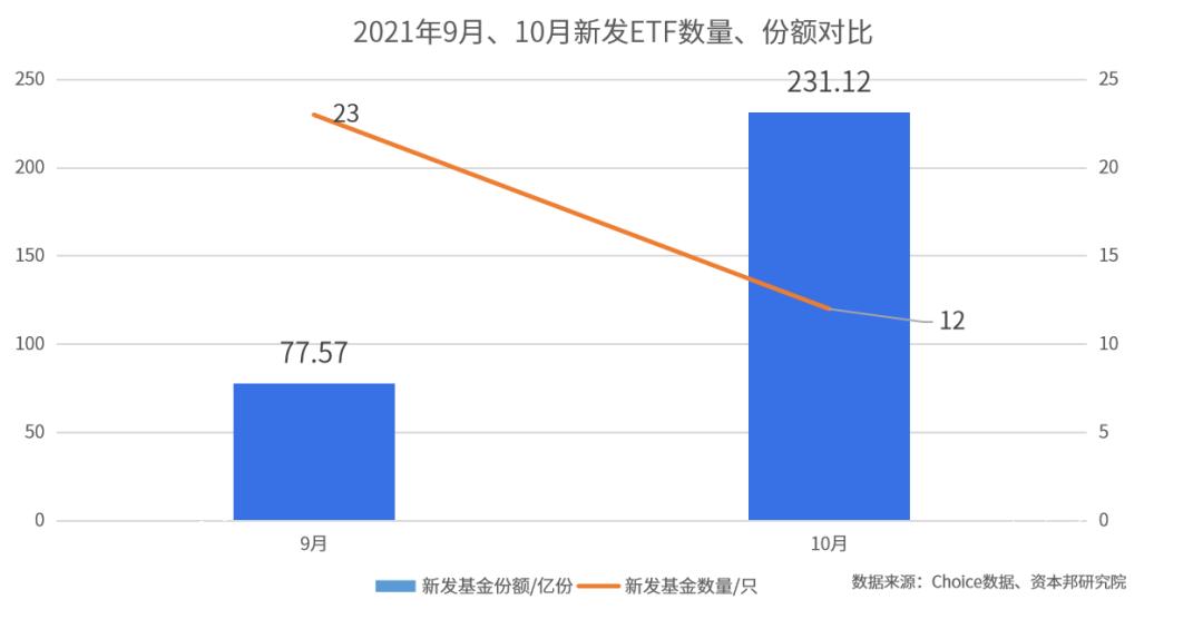 Choice数据显示,今年9月、10月新发ETF数量分别为23只、12只;合计发行份额分别是77.57亿份、231.12亿份。今年10月份,新发ETF份额环比9月大增近2倍。