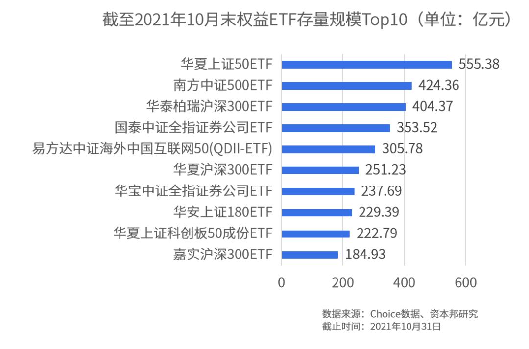 截至今年10月末,市场合计23只权益类ETF基金(混合型、股票型、其他型)规模超百亿。其中,华夏上证50ETF以555.38亿元的规模位居榜首,南方中证500ETF、华泰柏瑞沪深300ETF的规模均超400亿元。