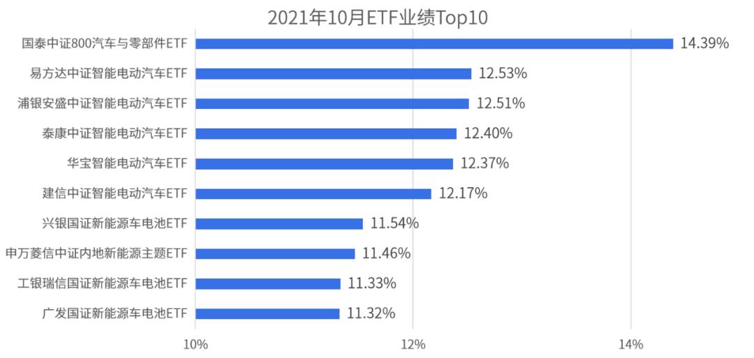 2021年10月,汽车、锂电池、光伏等新能源相关行业ETF基金业绩排名靠前。