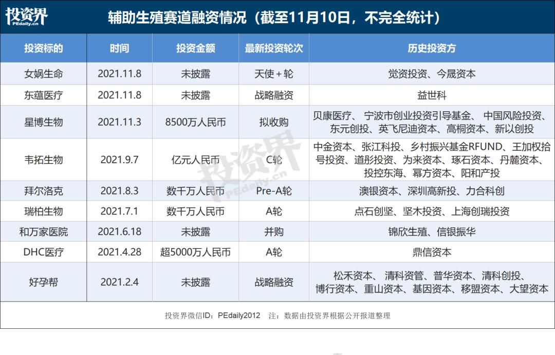 这是个隐隐爆发的风口。据不完全统计,今年至少有9家公司先后获得融资或被收购,分别是女娲生命、东蕴医疗、星博生物、韦拓生物、拜尔洛克、瑞柏生物、和万家医院、DHC医疗、好孕帮,背后投资方既有王刚的家族办公室基金觉资投资、中金启辰基金、松禾资本、幂方资本、丹麓资本、深圳高新投、鼎信资本等VC/PE机构,也有上市公司锦欣生殖、贝康医疗。