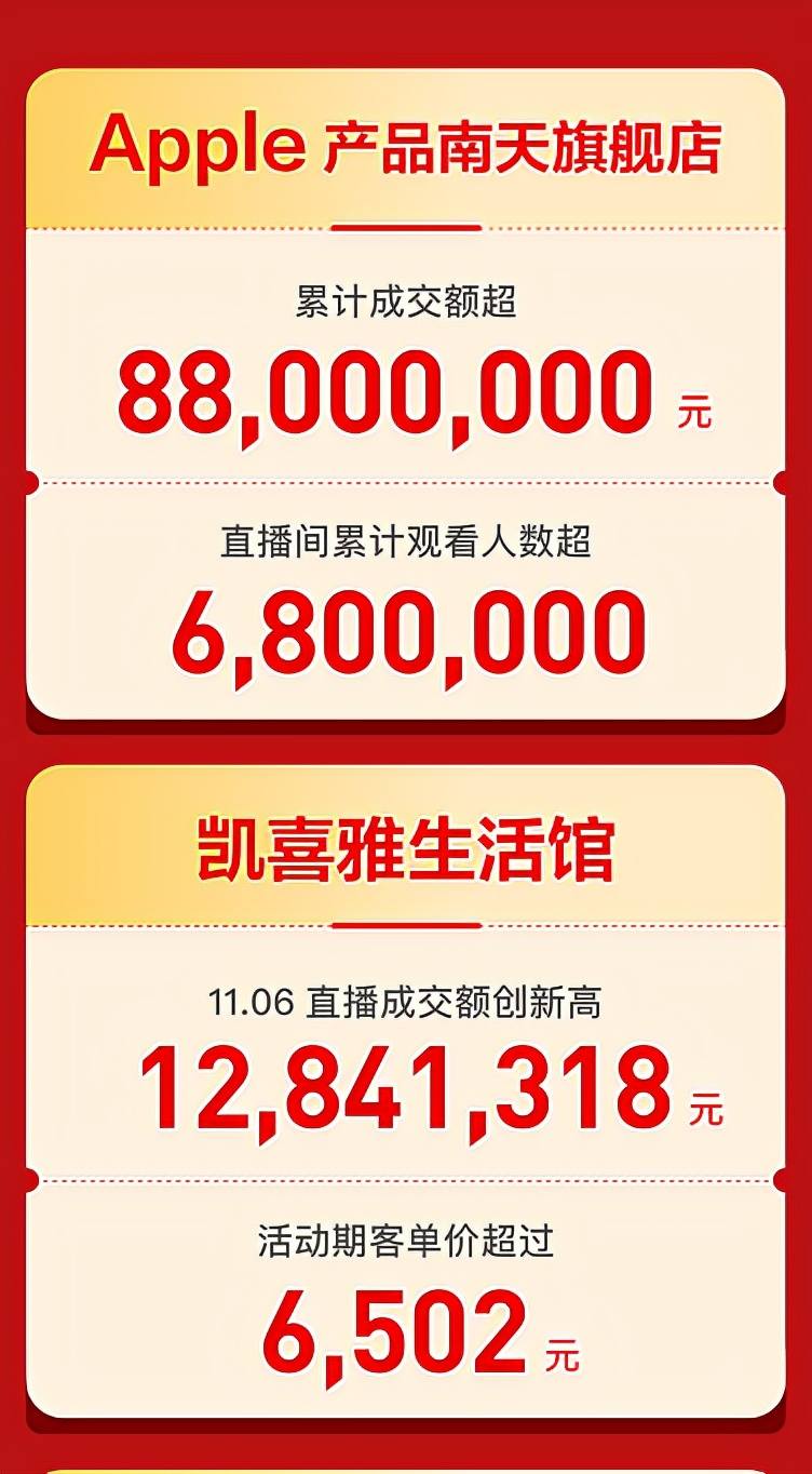 其中,Apple产品南天旗舰店直播累积成交额突破8800万;凯喜雅丝绸单场直播交易额突破1280万, 连续11日霸占服饰榜TOP10;百川名品酒水冷启动首次直播,卖出酒水150万;生活类达人二丫小妙招凭借与丽华大酒店跨界合作,单场直播销售额超203万;万物秀精选发动30位主播一同开播,创造销售额660万。