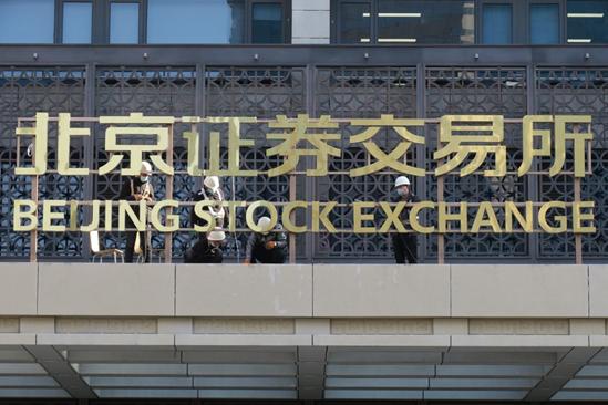 11月14日上午9点,北京金融街金阳大厦,施工人员正在高处作业,为大楼悬挂上“北京证券交易所”的招牌,楼前伫立的“全国中小企业股份转让系统”字牌并没有变化。