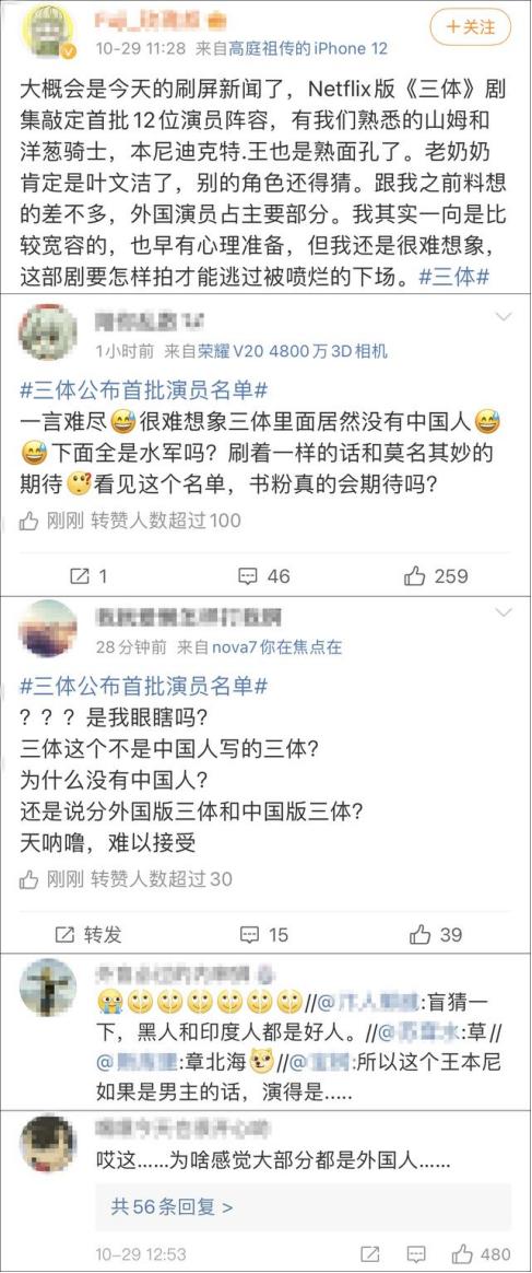 但最近主创名单的公布在中国科幻爱好者中引起了较大的争议,与原剧人设与较大出入的选角,和选角中鲜有亚洲面孔的现象,引发了网友对于改编内容的质疑和对海外版《三体》“去中国化”的担忧。外国人演中国故事,会不会“水土不服”?《三体》所传递的价值观会不会被西方价值观扭曲?《三体》故事的前提是复杂的历史背景,故事的发展也饱含着中华传统的人情世故、生死选择,海外创作能否能领会作品中的文化和情感的深刻内涵?