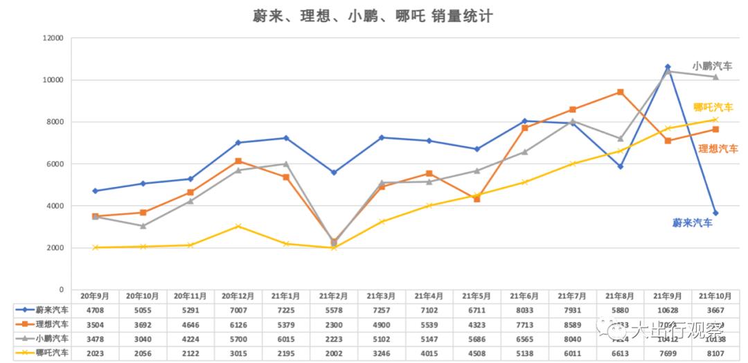 然而就在过去三个月,哪吒三次跻身造车新势力排名前三位。而它的对手们,蔚来、理想正遭遇芯片危机,8月和9月订单交付被延迟,即便到了10月,芯片危机仍未完全缓解。蔚来又遭遇工厂升级改造,满负荷运转仅十天。