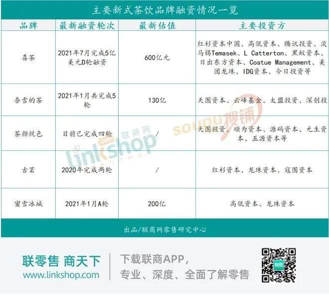 从资本的流向看,各细分赛道头部品牌是资本争抢的香饽饽。据联商网零售研究中心统计,喜茶、奈雪的茶、茶颜悦色、蜜雪冰城等茶饮品牌近年来都获取了至少上亿元融资。而随着茶饮市场的发展,资本的投资已经不只局限于头部品牌,沪上阿姨、CHALI茶里、椿风等品牌也在2021年获得了新的融资。