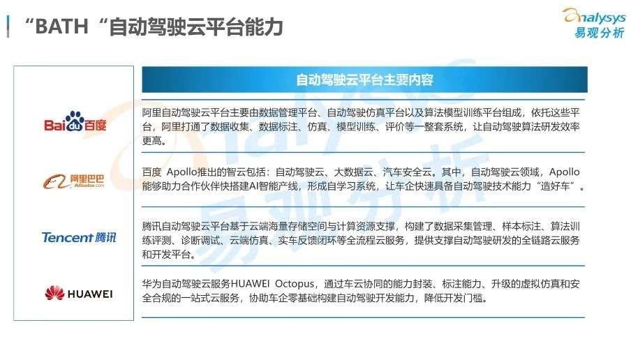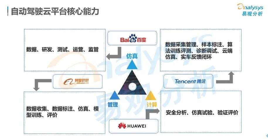 自动驾驶云平台核心能力主要围绕数据管理、计算和仿真测试,以满足车企 “云+端”研发迭代新模式,通过测试车队采集海量道路环境数据,在云端进行模型和算法开发和仿真验证,达到产品安全标准。整体来看,BATH在自动驾驶云平台能力输出大同小异,差异化并不明显。