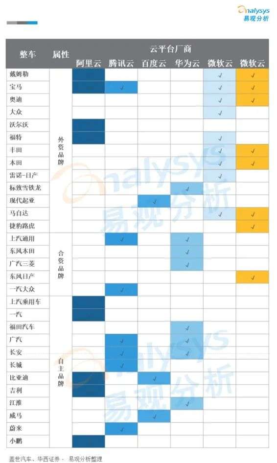 随着汽车产业智能化快速推进,云计算开始占据汽车产业链重要位置。明显的趋势是每一个传统车企都背靠着一家云计算巨头,具体来看,外资车企主要采用微软云和AWS,本土及合资品牌主要采用本土云像阿里云、百度云、腾讯云以及华为云等传统云计算厂商。