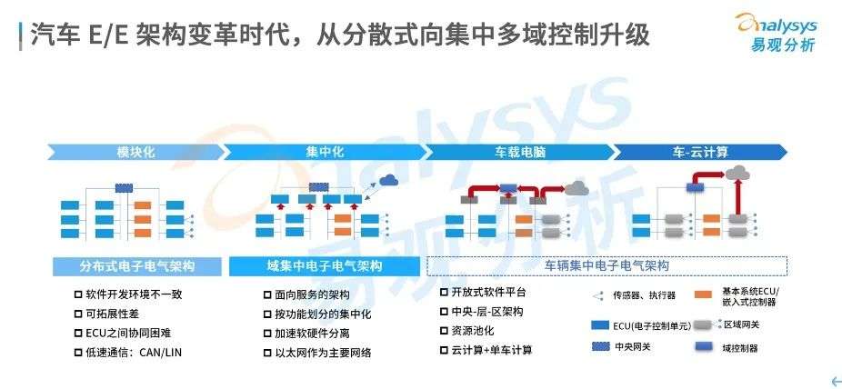 升级传统汽车采用的分布式E/E架构因计算能力不足、通讯带宽不足、不便于软件升级等瓶颈,不能满足现阶段汽车智能发展的需求。因此,汽车E/E架构开始从分散式向集中多域控制升级。
