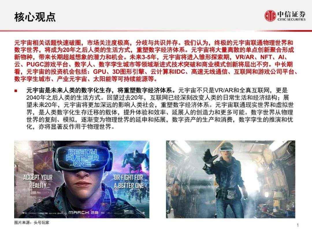 中信证券在研报中直言:“元宇宙是未来20年的下一代互联网,是人类未来的数字化生存。”在其看来,游戏和社交可能是元宇宙投资的起点,应用层方面,最先看到的突破可能来自于腾讯、字节跳动(抖音)、Facebook等巨头在游戏、社交等领域的探索;技术端方面,最具备投资价值的领域仍在头部公司具有较强技术和市场优势的关键领域,如GPU领域中的英伟达、图形引擎公司Epic等。