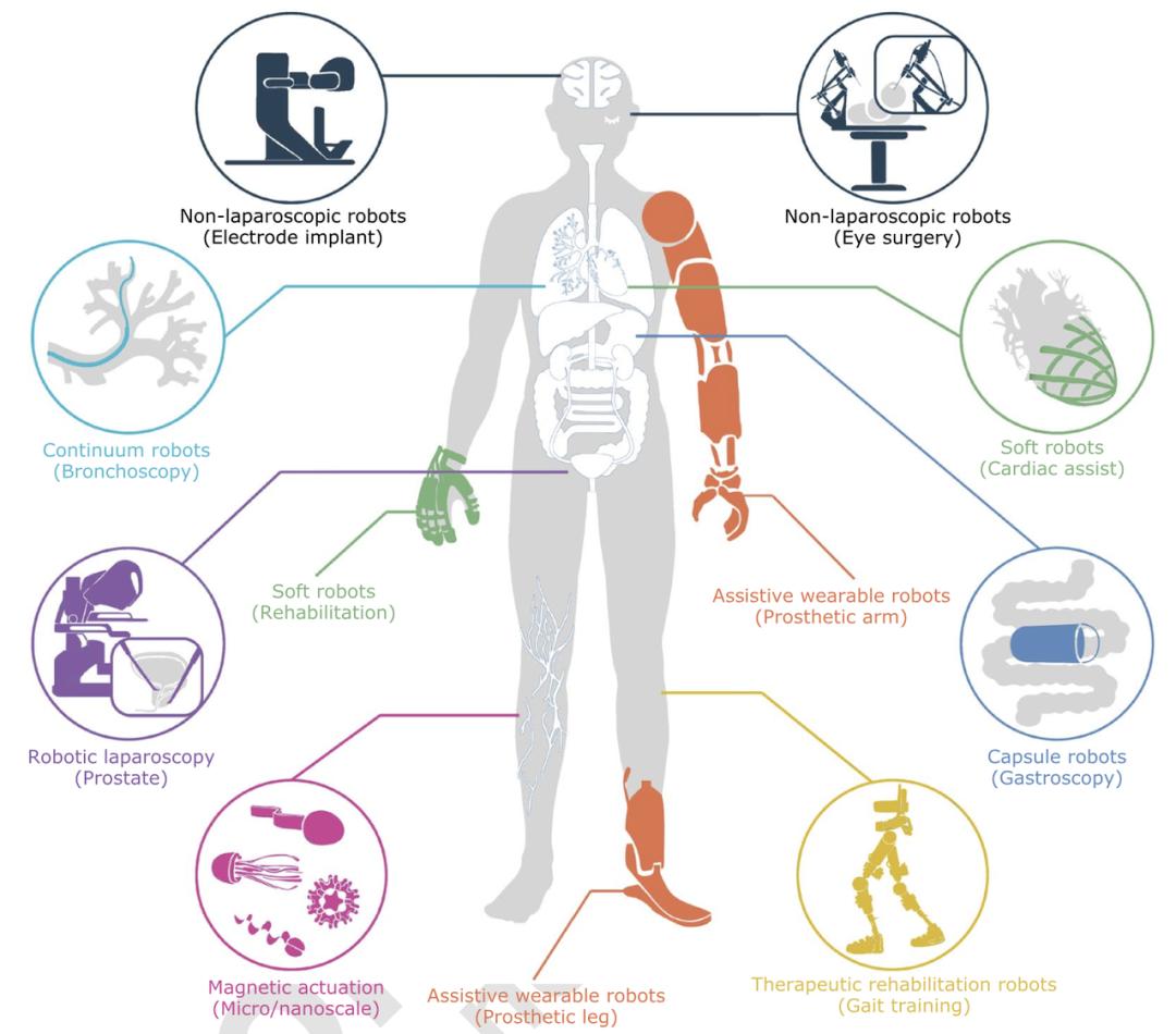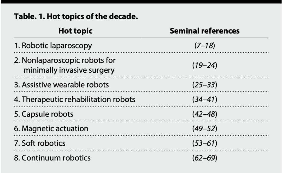 研究人员通过搜索 2010-2020 年期间《科学》杂志上被引用最多的医疗机器人论文,确定了八个热门研究主题,包括机器人腹腔镜、用于微创手术的非腹腔镜机器人、辅助穿戴式机器人、治疗康复机器人、胶囊机器人、磁驱动、软体机器人和连续体机器人等。