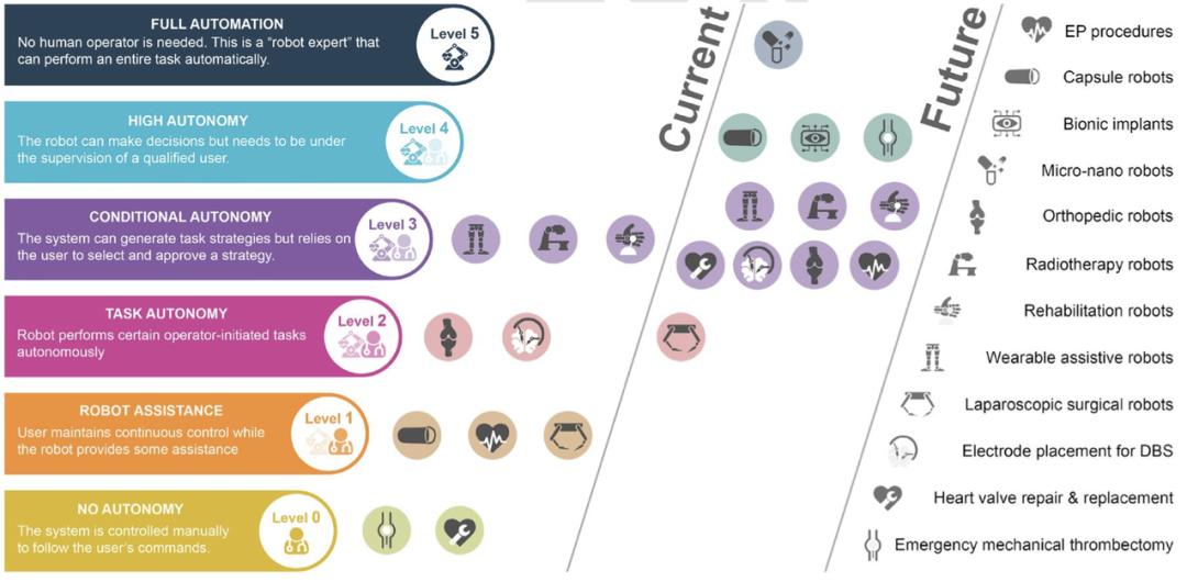 尽管该领域还不能指出临床试验表明机器人手术为患者提供了更好的手术结果,或与非机器人手术相比降低了手术成本,但已经证明了许多患者的益处,这些措施包括缩短住院时间、加快康复、减少再手术和减少输血。对于外科医生来说,医疗机器人提供了更好的人体工程学,与直接手控程序相比,机器人可以减少颈部和背部疼痛以及手部和手腕麻木,减少身体和精神压力,机器人技术也可以显著减少外科医生和患者的辐射暴露,这些因素一定程度上提高了外科医生的从业质量,并有可能延长他们的职业生涯。为了推动这一进程,将未来的工程研究工作引导到最有希望的方向将是有益的,这就需要了解机器人及其基础技术如何在医学上增加价值。例如能量输送机器人(用于放射治疗的机器人)提供精度、可重复性和速度的组合,这是其他方法难以比拟的。类似地,与非机器人设备相比,电动假肢可以增加日常生活任务的数量和质量,从而直接改善患者的预后。同样,胶囊机器人最终可能会取代一些开放式肠道手术,提高难以到达身体部位的诊断可能性,减少现有腔内肠道手术的不适感。在指导机器人技术研究以实现增值最大化的过程中,最重要的技术目标是那些能够基于当前技术实现的新型干预措施的目标。在未来十年中,软机器人技术很可能成为一项非常重要的使能技术。