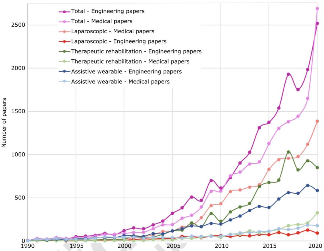 工程杂志的出版物涵盖了医疗应用新机器人技术的创造和新型医疗机器人的设计,医学杂志的出版物通过评估人类患者中现有的机器人设计完成了研究过程。