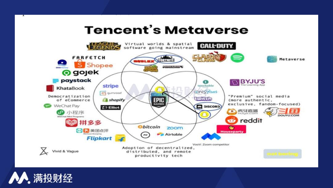 而从内容角度来说,元宇宙的庞大体系将会带来丰富的内容,并且内容将会是以实时生成、实时体验、庞大的内容产量则需要有规划的梳理框架,才能够实现每个宇宙的“互联互通”。从商业模式角度,商业模式卡位“元宇宙”发展路径的标的,并有能力跨纬度连接泛娱乐产业链IP运营的集团会更有优势,类似深耕游戏社交平台的Roblox、Facebook,或是要基于泛娱乐领域优势布局“全真互联网”的腾讯,会在元宇宙的长跑中具有优势。