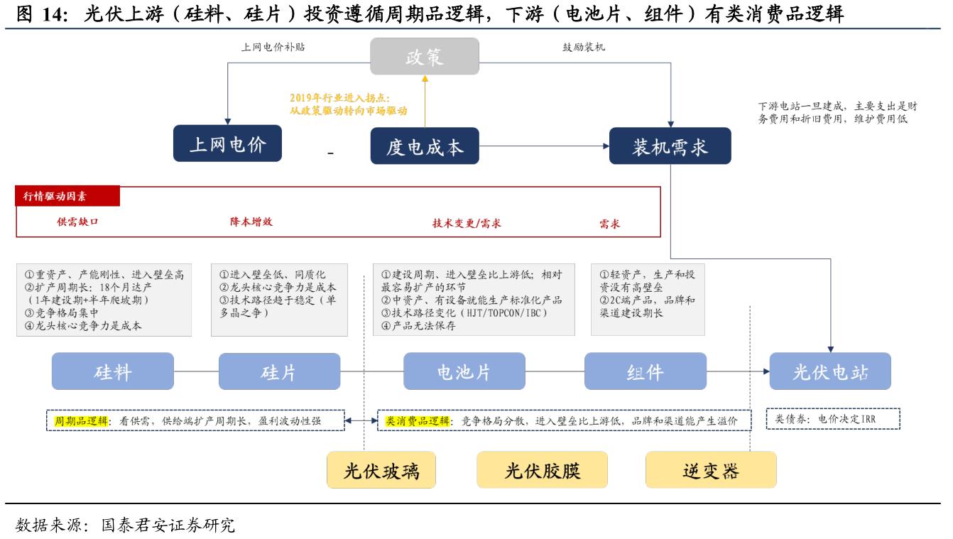 下游(电池片、组件)则类似消费品逻辑,进入壁垒和建设周期比上游低,技术更新和需求景气都会驱动该环节点产生超额收益。