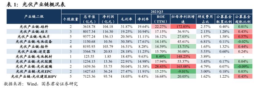 总的来说,光伏产业链包括上游原材料采集加工、中游电池片组件制造和下游光伏电站建设和运营。其中,上游硅料和光伏玻璃是盈利最优的环节,但最受公募关注的是一体化龙头——隆基股份、阳光电源和通威股份。