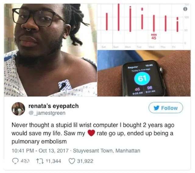与此同时,市场上不断爆料出以智能手表为核心的可穿戴设备频繁“救人”事件又给业界打了一针强心剂。例如2018年,曾有国外网友爆料称自己在使用Apple Watch Sreies 4的ECG心电图检测功能时,被提示他有“心房颤动”(简称“心颤”或“房颤”,严重时可能导致血栓或心力衰竭)反应,最终在智能手表的建议下,该名爆料者完成就医并“捡”回了一条命。而这样的案例实际上多如牛毛。