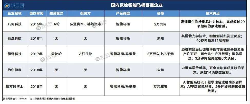 有投资人对猎云网表示,排泄物检测原理类似中医的“望闻问切”,望就是看,通过高清摄像头及温度等传感器可以实现,问就是在线问诊,切就是要专业仪器,关键点在于闻——在马桶上加装传感器等设备,通过体味及颜色等辨别推断出疾病。
