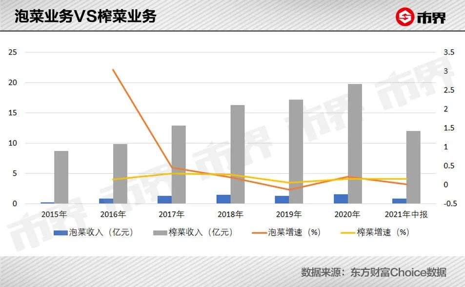 新时代证券研报显示, 泡菜市场规模约为榨菜的10倍,但是蛋糕大不一定吃得下。 涪陵榨菜泡菜业务的进展并不乐观,在经历了头两年的快速增长后,便进入沉寂。近三年,泡菜业务收入平均增速只有3%,低于榨菜的增速12%。