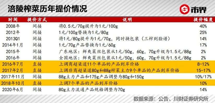 直接提价,是直接提升出厂价或者零售价,抑或两者均有。光大证券研报指出,从涪陵榨菜的发展历史来看,出于维持渠道利润率的考虑,较少出现提升出厂价而不提升终端售价的提价策略。