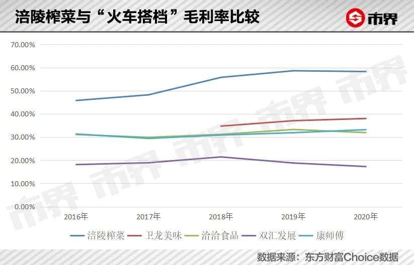 无论是行业地位,还是产业源头的优势,都足以看出涪陵榨菜的“话语权”。 从毛利率来看,涪陵榨菜比它的“火车搭档”卫龙、洽洽、双汇、康师傅高出不少。