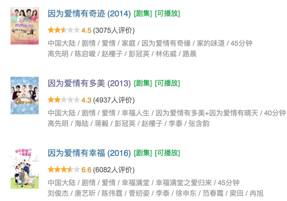 从2013年的《因为爱情有多美》到2014年的《因为爱情有奇迹》再到2016年播出的《因为爱情有幸福》,三部剧,总集数超过280集,但全网收视连续多日破4%,真切验证了狗血才是客厅刚需。