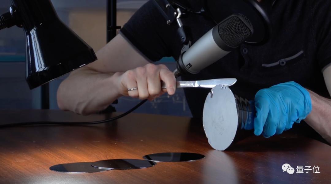 小伙下一步做的是把硅晶体切割成薄片,这就是经常能听到的晶圆了。
