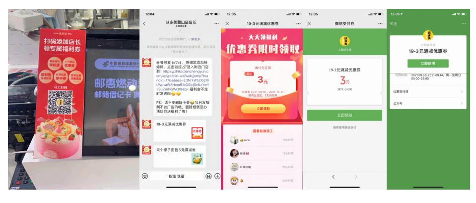 在前台味多美通过物料铺设和店员话术引导,让顾客到店扫⻔店物料上的⼆维码,添加⻔店企微号, 进⼊门店的私域中领券。