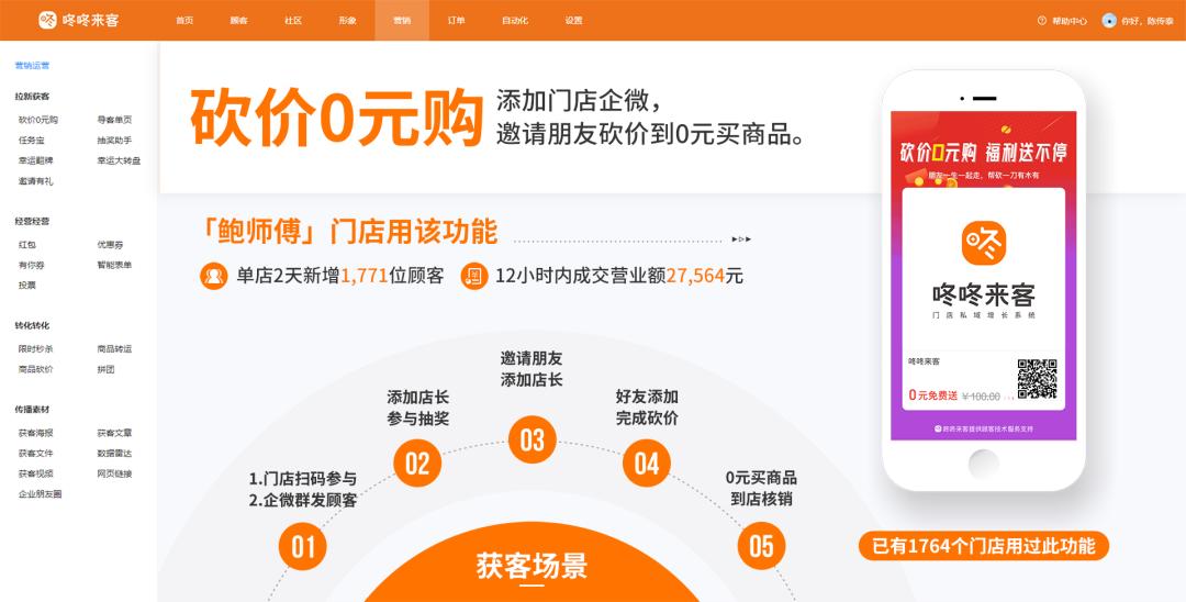 私域经营过程中,通过咚咚来客的砍价功能设置活动,驱动老顾客邀请新顾客,邀请朋友参与就可以获得低价优惠的门槛。