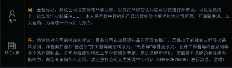 36氪讯,2021年08月03日。36氪获悉,双汇发展在互动平台表示,目前公司在加强调味品的开发和推广,已推出麻辣和三鲜等火锅料系列、炸酱面拌酱和“酱滋牙”拌面酱等面条料系列、“甄骨鲜”等骨汤系列、香辣牛肉酱等肉酱系列等多个系列调味品;公司会继续加强线上平台新媒体营销,促进品牌年轻化,不断提升品牌的美誉度和影响力。
