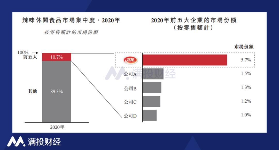 从竞争格局来看,中国的辣味休闲食品市场相对分散,按零售额计,2020年前五大参与者的市场占有率仅为10.7%,其中卫龙的市场份额为5.7%,为中国最大的辣味休闲食品参与者,第二名至第五名的市场份额为1.5%、1.3%、1.2%和1.0%,卫龙的份额超过第二至第五名参与者的份额之和,领先优势明显。