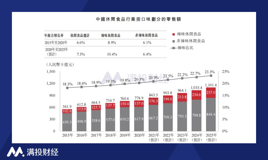 辣味在中国饮食习惯中历史悠久,随着近年来辣味休闲食品行业的发展,众多食品生产商持续开发新型辣味休闲食品以适应不断变化的消费者偏好,推动了辣味休闲食品行业的增长。根据弗若斯特沙利文报告,中国的辣味休闲食品行业的零售额由2015年的人民币1,026亿元增长至2020年的人民币1,570亿元,年复合增长率为8.9%,高于中国整体休闲食品行业同期年复合增长率6.6%。预计到2025年额零售额将达到人民币2,570亿元2020年至2025年的年复合增长率将提升至10.4%。