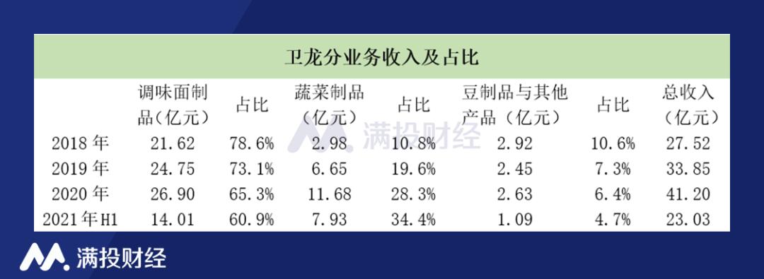 卫龙也意识到了这一问题,从2018年至2021年上半年,公司“辣条”的收入占比从79%下降至61%,蔬菜制品的收入占比从11%上升至34%,降低了公司对单一业务的依赖。