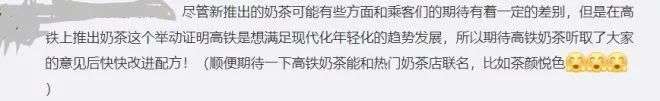 有网友直言,虽然目前推出的奶茶与消费者期待有一定差别,但这个措施证明了高铁满足年轻化的趋势,希望能汲取大家的意见积极改进,甚至可以与茶颜悦色等知名茶饮品牌联名。
