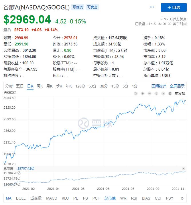 2021年11月8日,谷歌母公司Alphabet盘中涨超1%,刷新日高至3010.86美元,市值突破2万亿美元。今年是谷歌的丰收年,自年初其股价累计涨幅近70%,远超标普500和FAAMG表现。