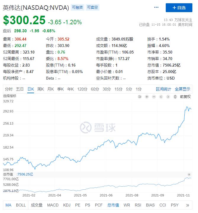 英伟达于2021年11月4日美股盘中暴涨,涨幅一度突破17%,股价一度超过300美元,最终报收298.01美元,续创历史新高,市值超7400亿美元。此前它于11月2日市值首次超过伯克希尔哈撒韦公司,位居全美第七。年内,英伟达股价涨幅超过136%,冠绝一众巨头。