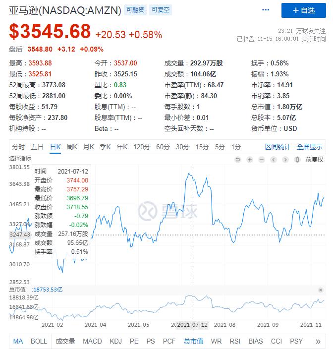2018年9月4日,亚马逊紧随当时苹果的万亿市值飞跃,成为美国第二家市值破万亿的上市公司,当年其股价在年内已翻倍。