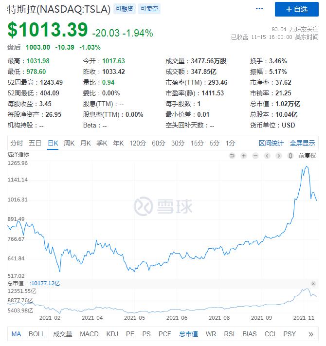 2021年10月26日,特斯拉股价盘中市值突破1000美元,市值应声超越万亿大关,成为继苹果、亚马逊、微软、谷歌和Facebook后,美股历史上第六只市值超过一万亿美元的股票,也是首家市值突破一万亿美元大关的汽车企业。