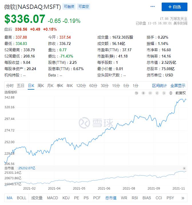 2021年6月22日,微软市值微软股价于最高触及了265.79美元,市值突破2万亿美元。微软在2019年市值突破1万亿美元,同样是两年走向翻倍。