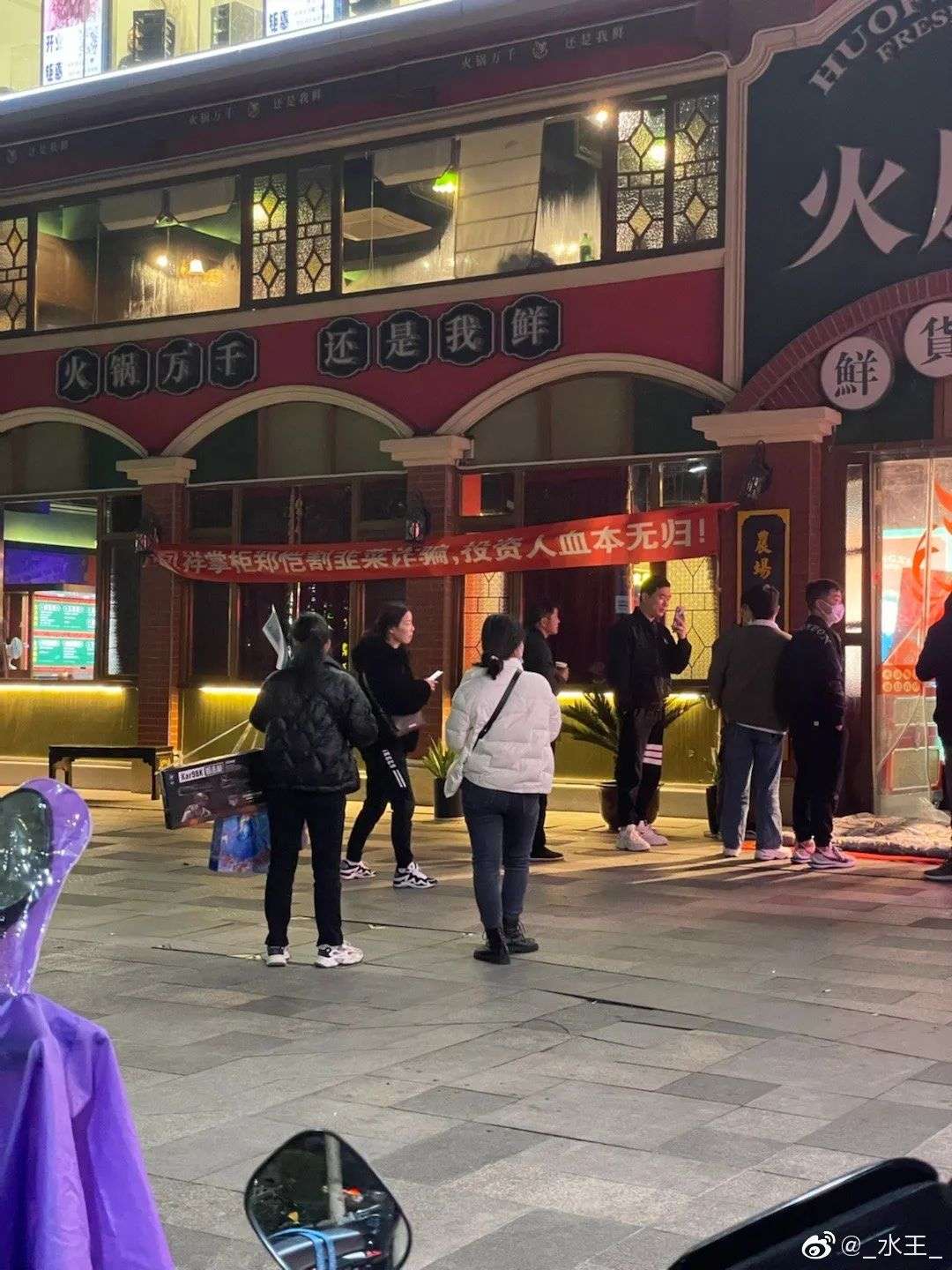 11月9日,有网友爆料称郑恺位于宁波的火凤祥火锅店全球总店被人拉横幅维权引发争议。根据曝光的照片来看,火锅店门口拉起一横幅,上面写着“火凤祥掌柜郑恺割韭菜诈骗,投资人血本无归!”